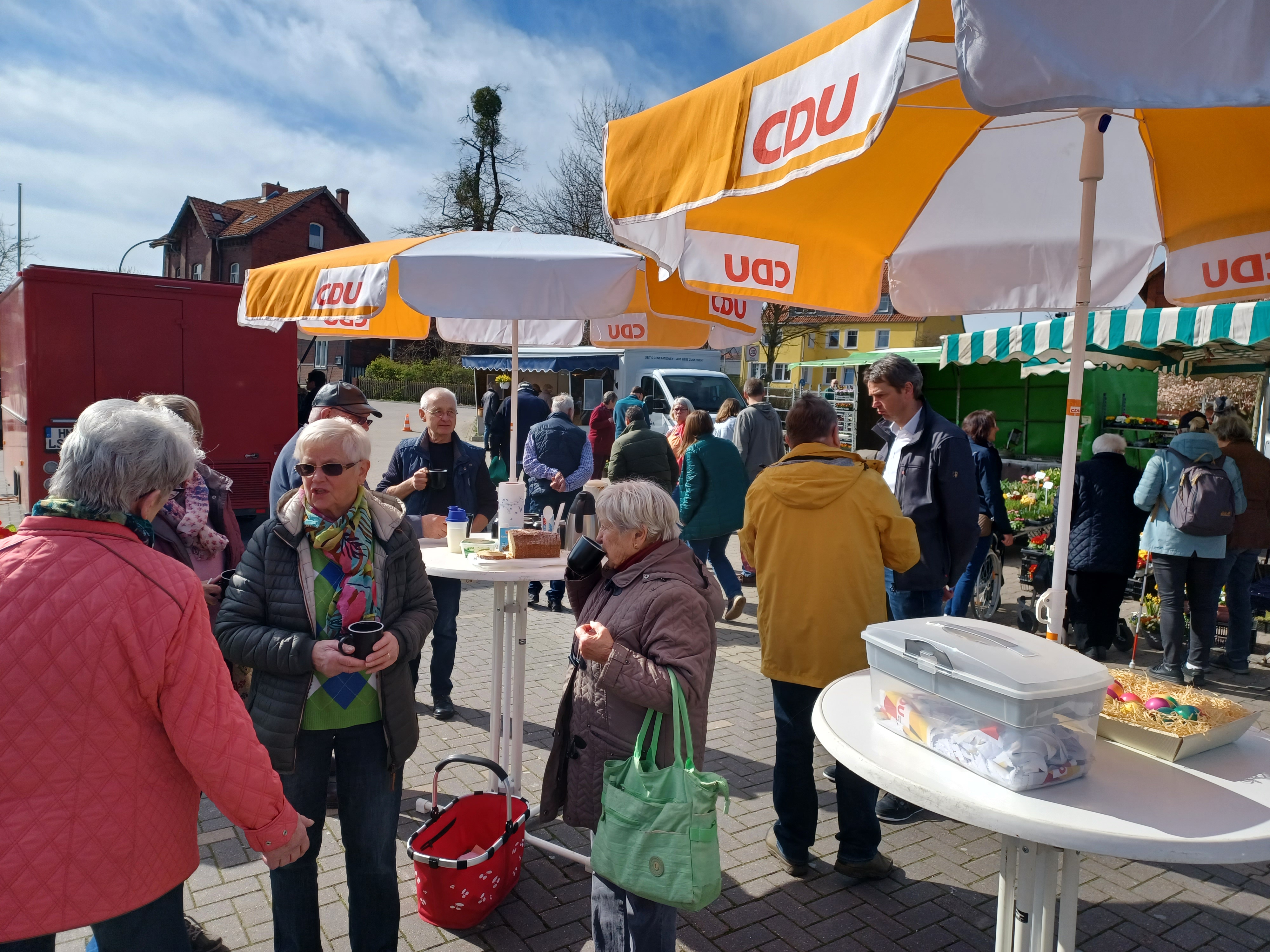 Traditionsgemäß verteilt der CDU - Gemeindeverband an dem Markttag vor dem Osterfest gefärbte Ostereier an seinem Informationsstand.